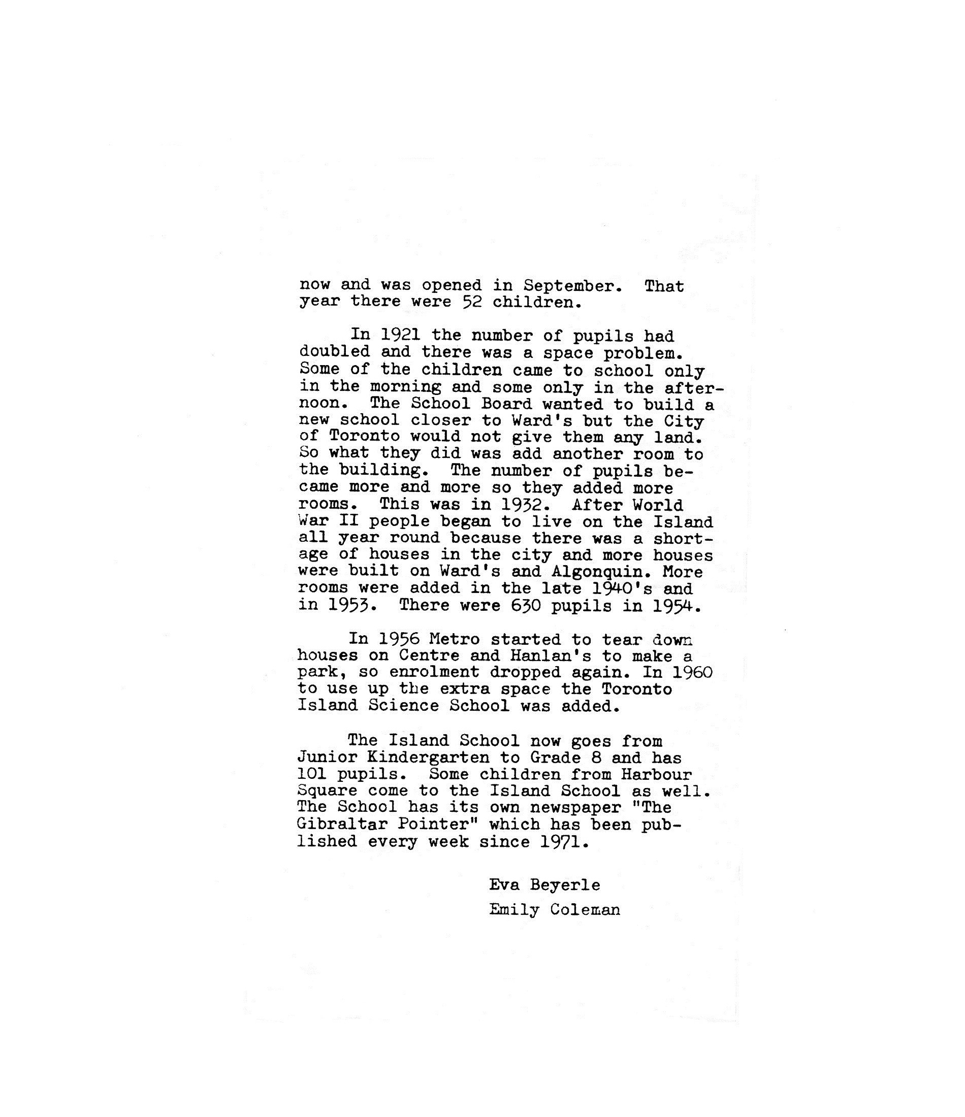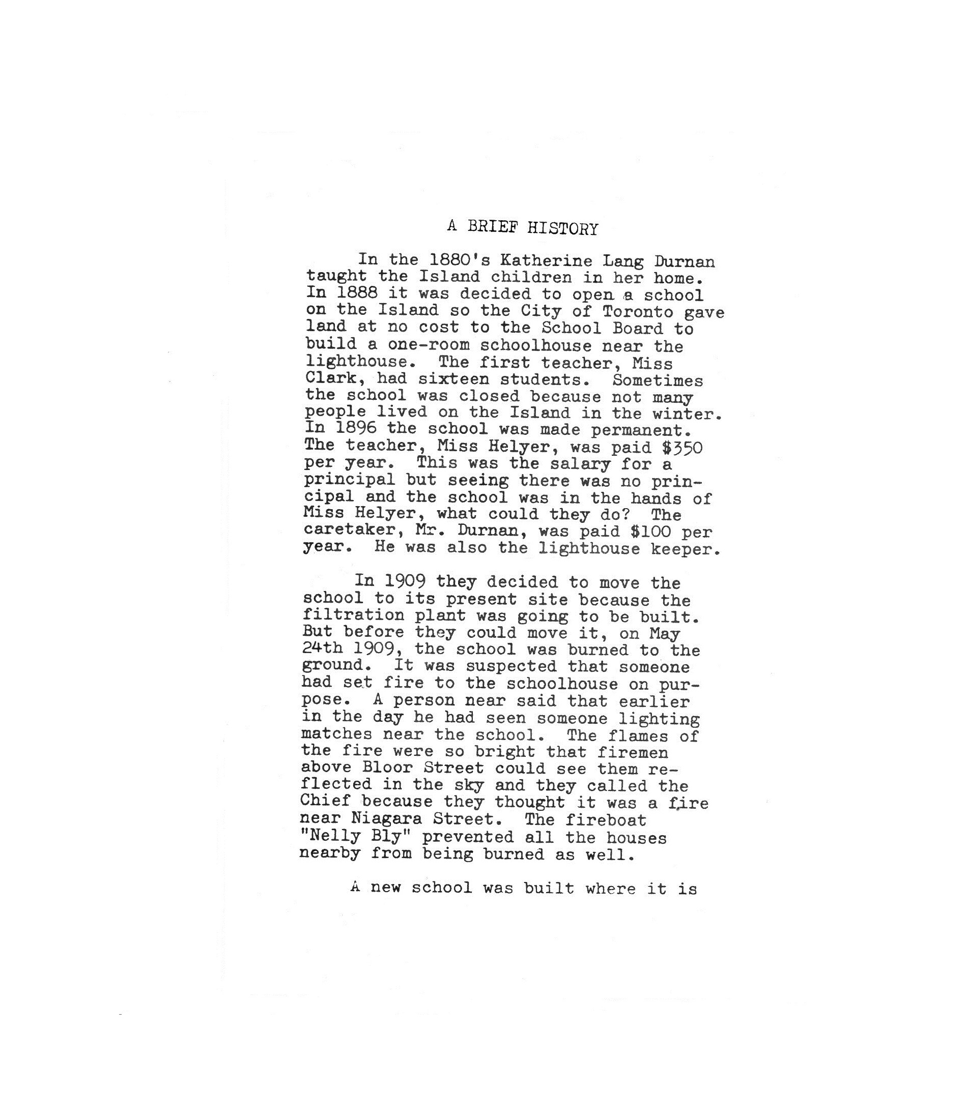 • Provenance: From the archives of Ted English. “A Brief History” of the Island Public School: 1888-1978