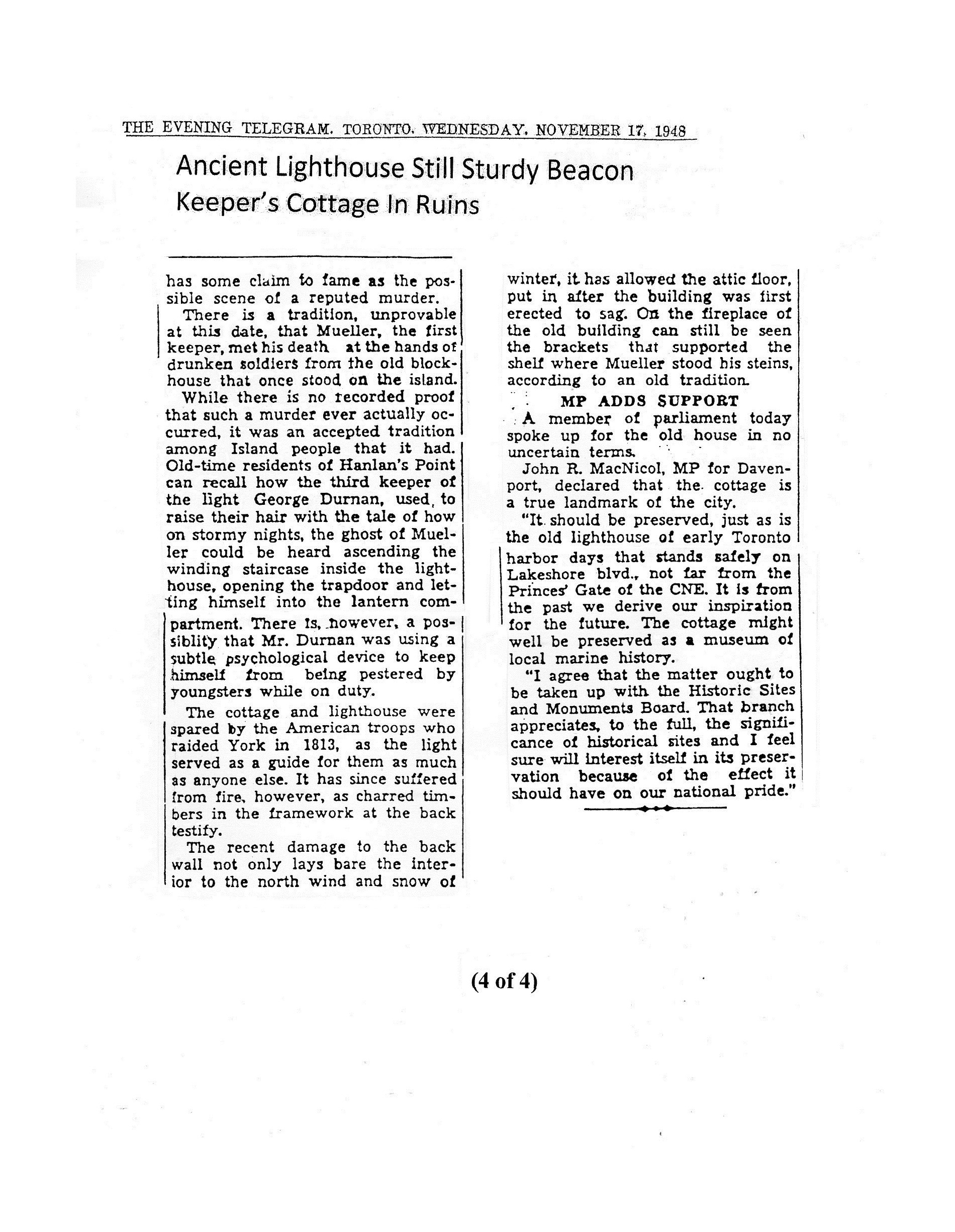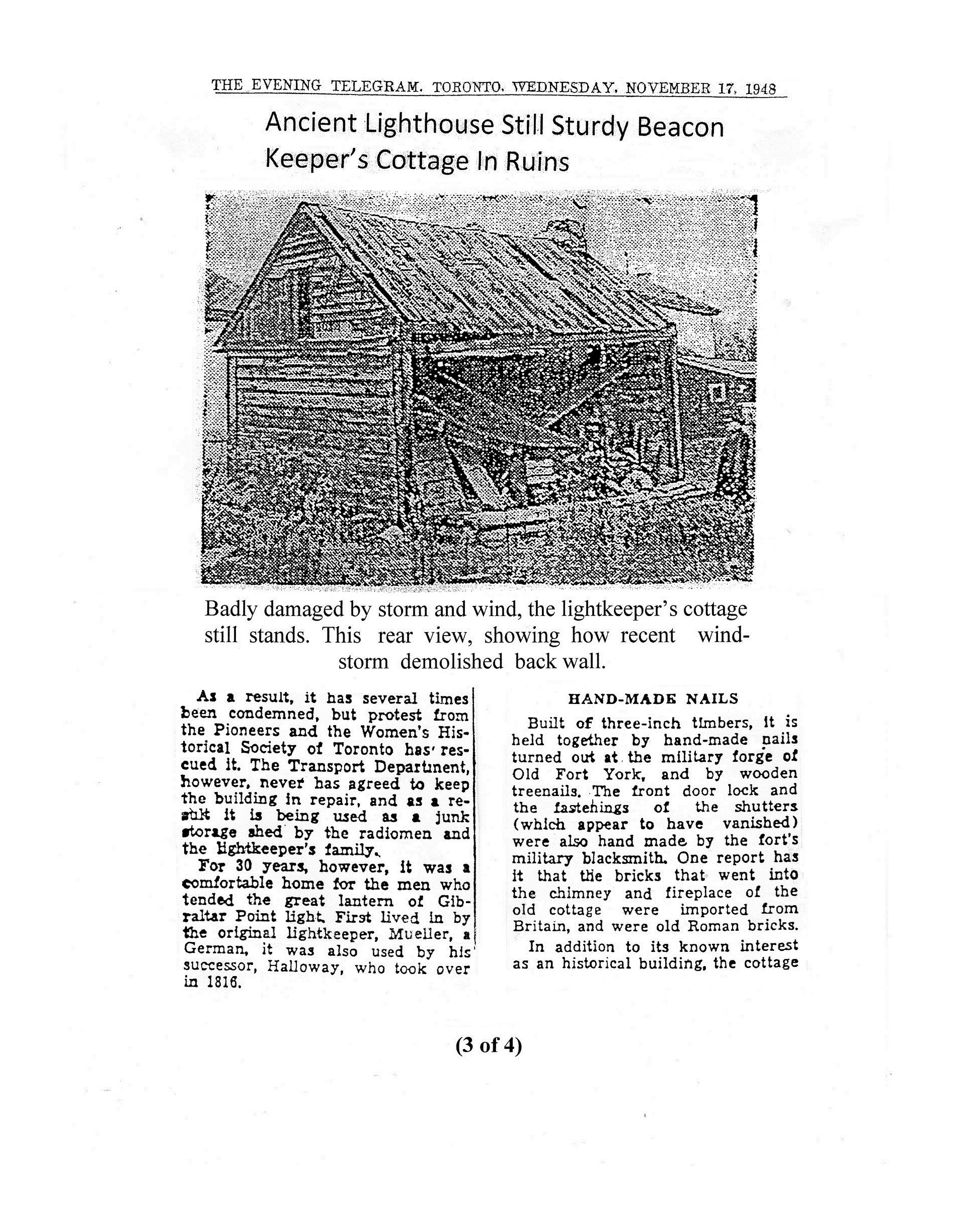 Hundred years of history in record of Island light. Memorable events of past century seen from ancient bea- con Tower that guards Toronto Har bor. Mariners of countless voyages owe much to kindly glare of old stone lighthouse. Many storms have raged beneath this rugged pile, while more than once wreckage has been littered along the Island sands.